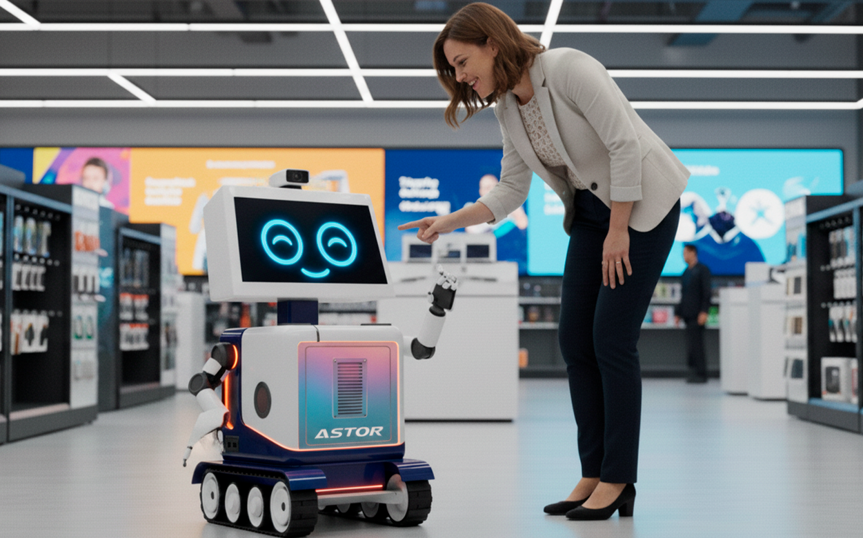 Astor é um robô vendedor autônomo que revoluciona o varejo físico. Ele circula pela loja, reconhece clientes, recomenda produtos baseado em histórico e fecha vendas. Não é ficção científica, é tecnologia aplicada ao varejo.